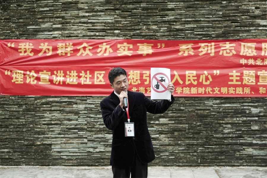 为了深入学习宣传贯彻习近平新时代中国特色社会主义思想,扎实做好理论宣讲工作,推动新时代党的创新理论落地生根、开花结果,让社区群众学习更有针对性,此次活动以深入学习习近平法治思想和习近平文化思想为主线开展主题宣传教育活动。宣讲员徐萌远以《法律,社会稳定的基石》为题,以历史经典案例和通俗易懂的语言宣传了我国的立法历史渊源,表明法律对维护社会稳定的重要意义,启发他们的思考与共鸣,让社区群众了解法律的重要性,增强他们的法治观念,为社区小朋友的心中播下法治的种子,号召社区群众为共同建设法治中国贡献自己的力量。宣讲员徐金秋首先现场展示中国传统服饰马面裙工艺之美,其后以《闪耀在岁月长河中的璀璨明珠》为题,从中国传统服饰在当代的传播路径切入,展现年轻一代对弘扬传统文化、自觉维护传统文化的主动性,增强社区群众的文化自信,激发社区群众在新的历史起点勇担续推动文化繁荣、建设文化强国的历史使命,为北海市创建全国文明城市贡献力量。