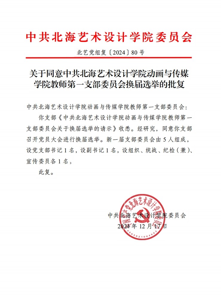 关于同意中共北海艺术设计学院动画与传媒学院教师第一支部委员会换届选举的批复