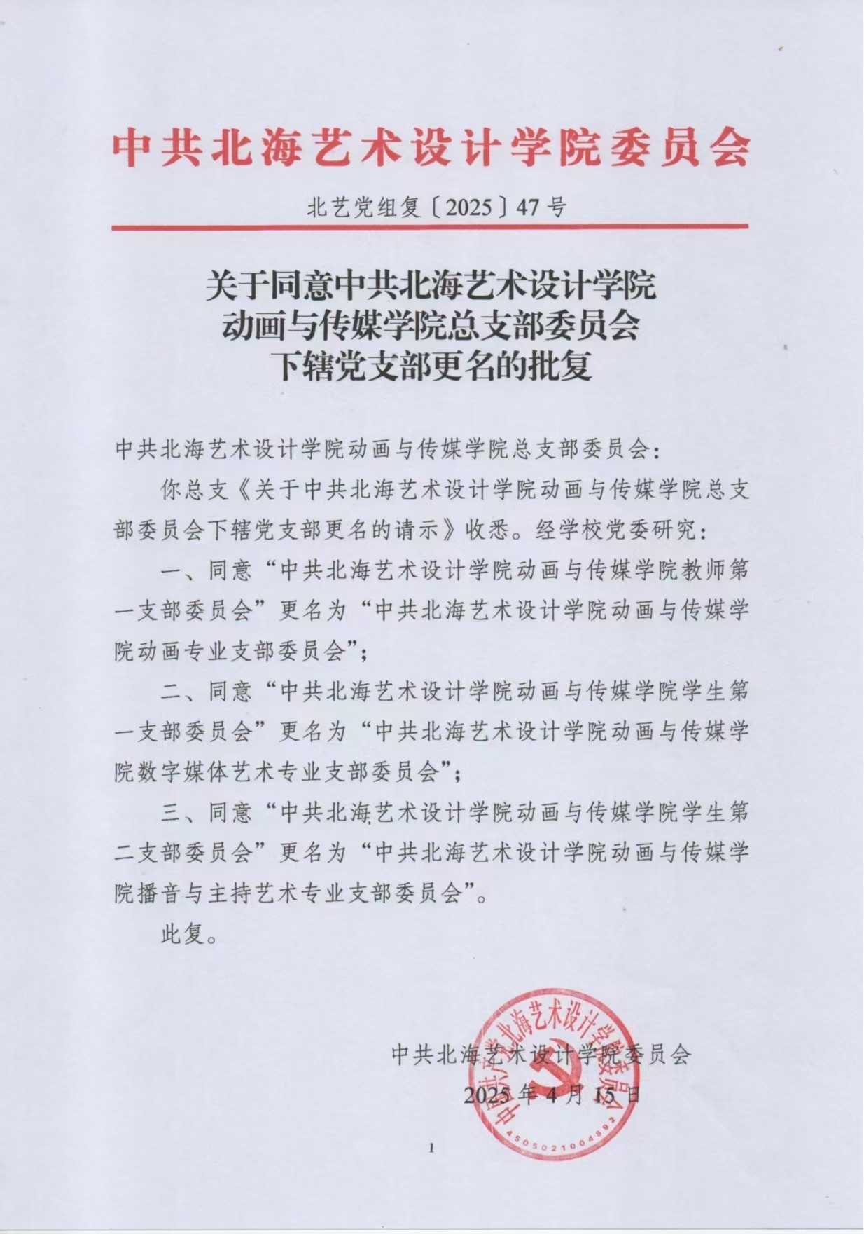 关于同意中共北海艺术设计学院动画与传媒学院总支部委员会下辖党支部更名的批复