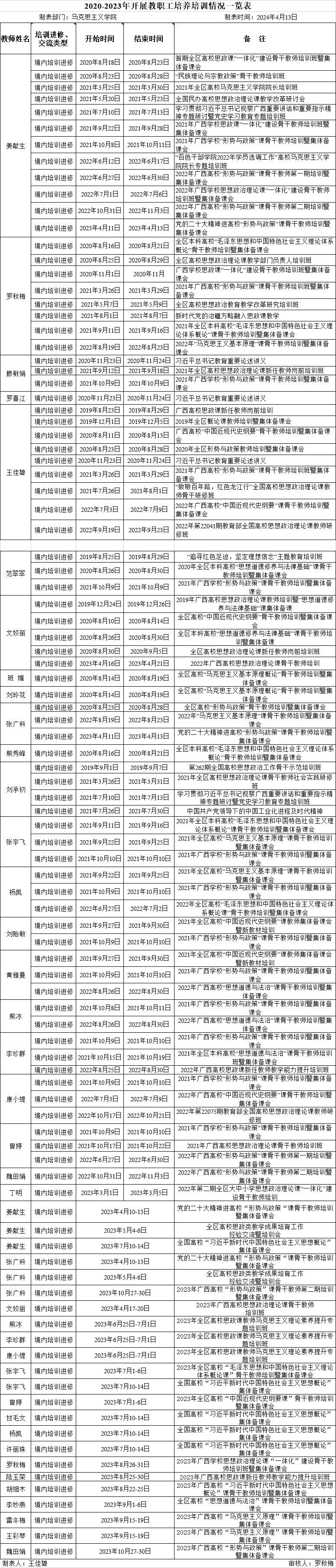2020-2023年开展教职工培养培训情况一览表