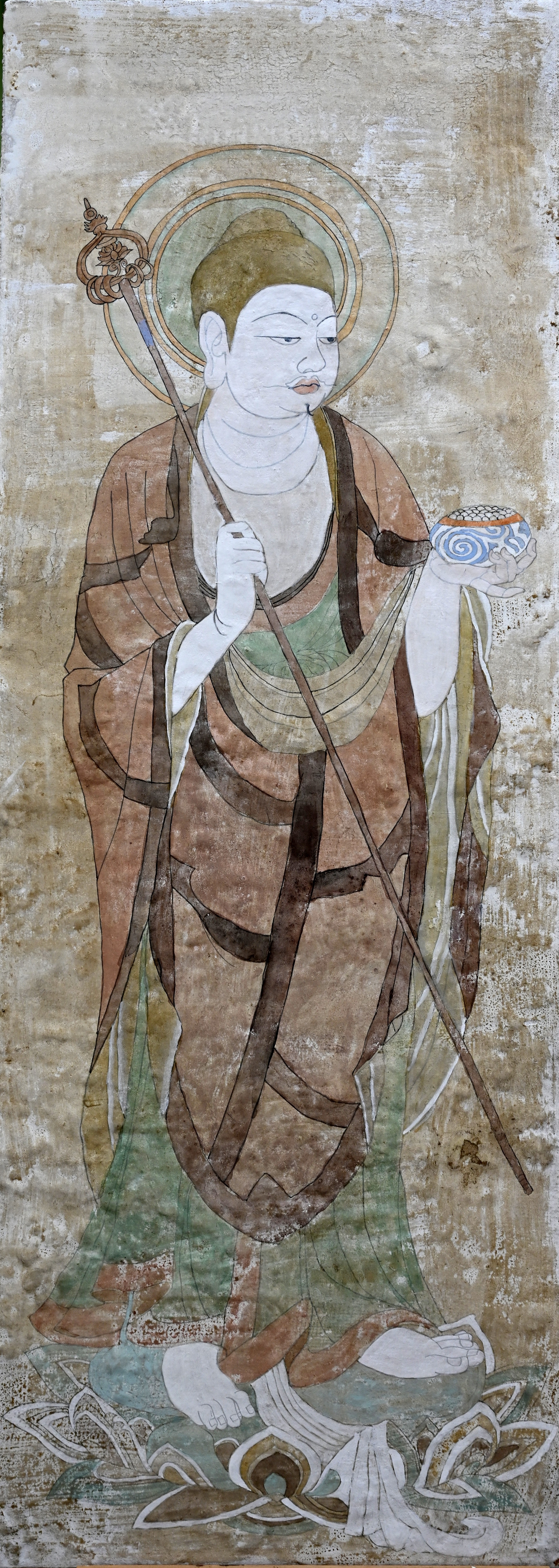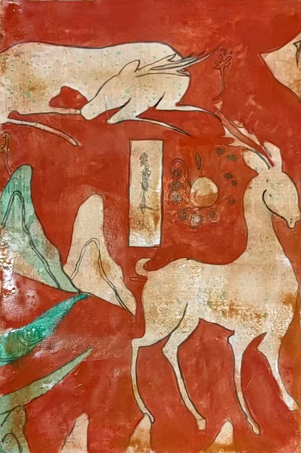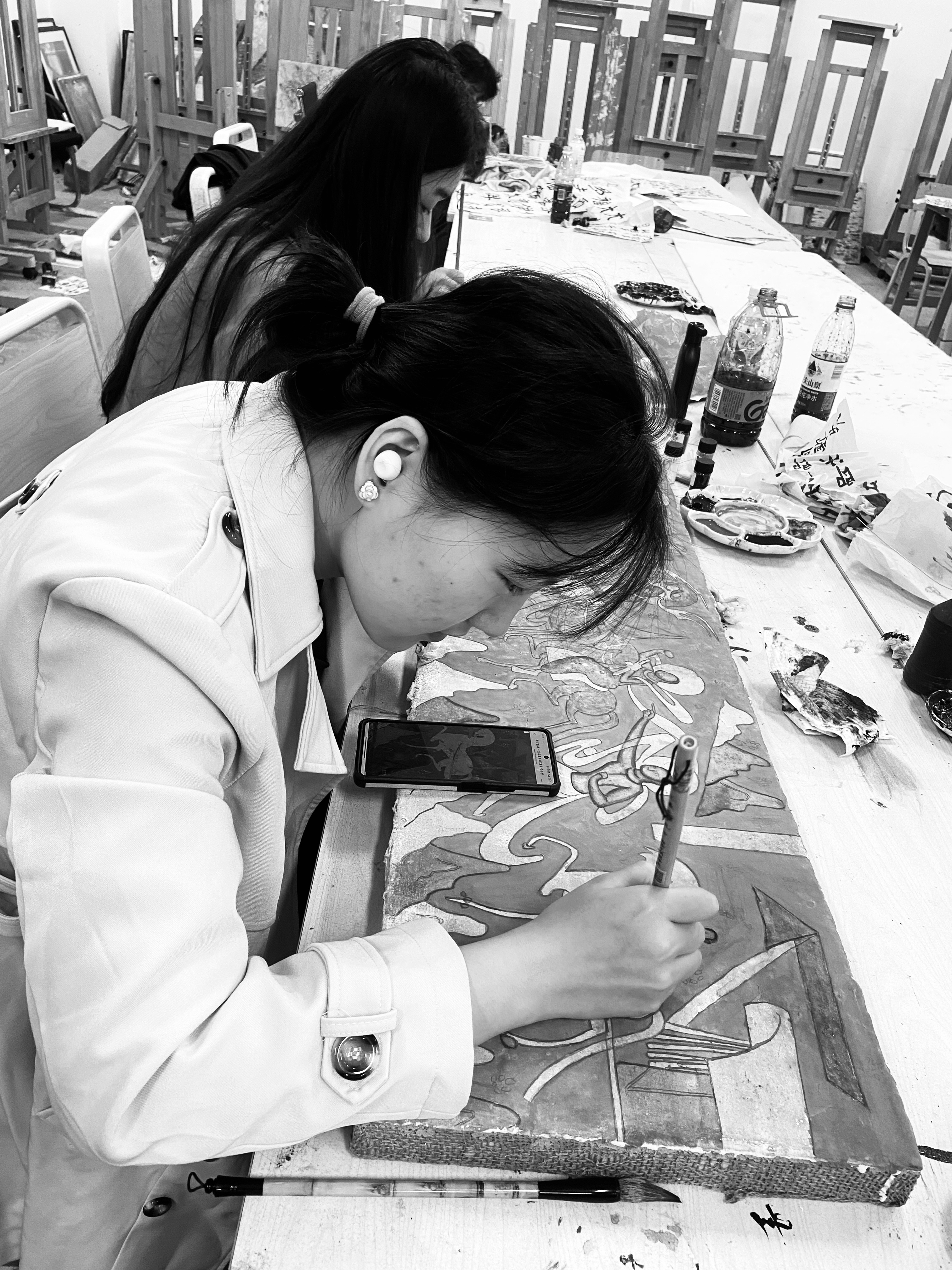 胡老师带着我们做地仗、模拟最真实的壁画体验,我们的作品也与原画同大,这都让我们更能深刻体会中国传统壁画绘画的语言表达。刚刚上手画的时候,我不太敢画,我们的画幅是最大的,但效果一直不强,导致我们小组出现明明应该是人多力量大却进度缓慢的问题。后来胡老师告诉我们254窟是北魏时期的,风格粗犷,可以大胆画…一直鼓励我们引导我们大胆的表现,最后我明白完成比完美更重要。在初次上色时,我采用水彩技法里的平涂法铺色与壁画原作有着较大差距,胡老师后来告诉我们中国画要以线造型,用线找型,通过练习,我也逐渐感受到了中国画画法的独特魅力。
