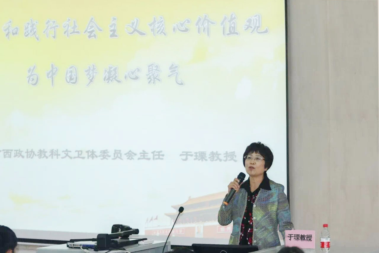 为深入学习贯彻习近平总书记系列讲话精神,培育和践行社会主义核心价值观,1月11日下午,自治区政协科教文卫体委员会主任于瑮教授应邀到我院名师大讲堂,为全院500多师生作了题为《培育和践行社会主义核心价值观,为中国梦凝心聚气》的精彩报告。