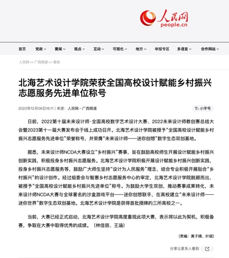 人民网:北海艺术设计学院荣获全国高校设计赋能乡村振兴志愿服务先进单位称号