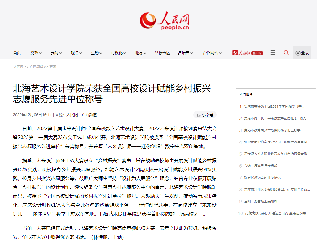 人民网:北海艺术设计学院荣获全国高校设计赋能乡村振兴志愿服务先进单位称号