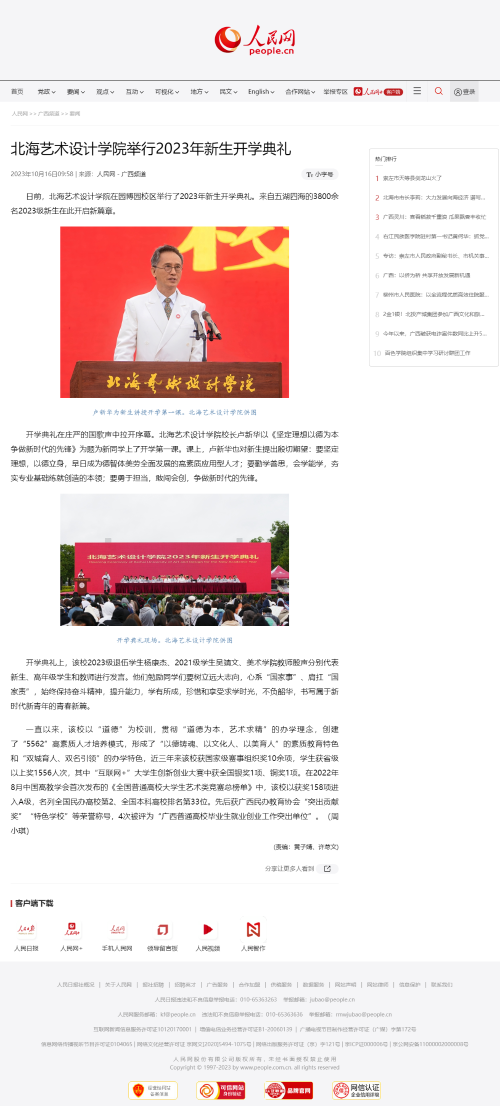 人民网:北海艺术设计学院举行2023年新生开学典礼