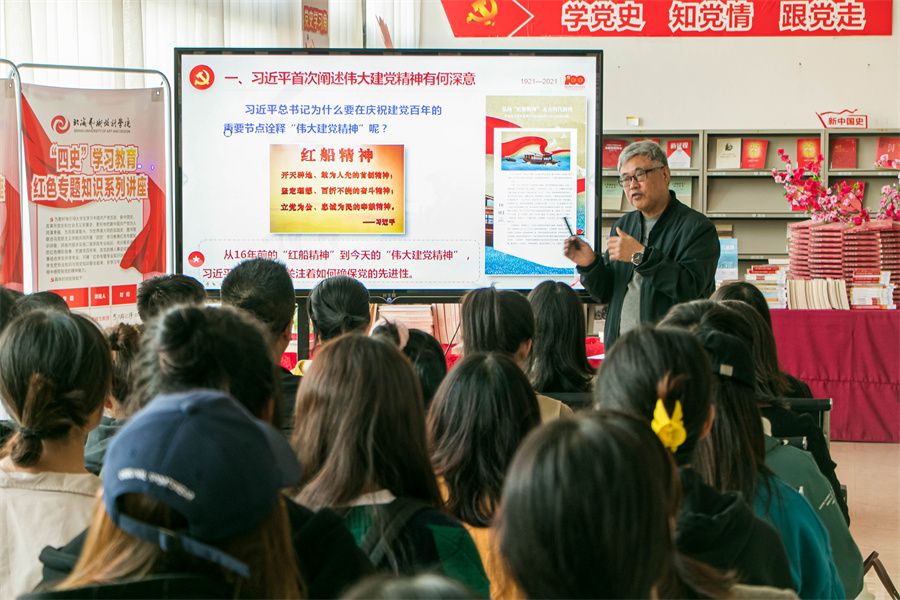 为持续推进“四史”教育进校园、进课堂,营造知史爱党、知史爱国、爱社会主义的浓厚红色氛围,11月25日下午,马克思主义学院院长姜献生教授在图书馆三楼“红色阅读角”开展“四史”红色知识教育系列讲座之《精神之源 薪火相传——伟大建党精神奠定中国共产党精神谱系的根基》,马克思主义学院和人文教育学院部分师生共60人参加讲座。