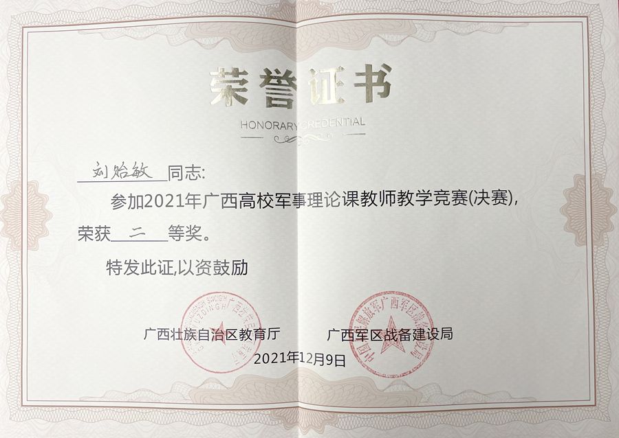 12月8日至9日,2021年广西高校军事理论课教师教学竞赛(决赛)在右江民族医学院举行。本次竞赛由广西壮族自治区教育厅,广西军区战备建设局联合举办,全区共有191名高校选手参加初赛,经过激烈角逐,最终评选出25名选手进入现场决赛。我校马克思主义学院老师刘贻敏在决赛中表现优异,荣获二等奖,充分展示了我校青年教师良好的精神面貌。