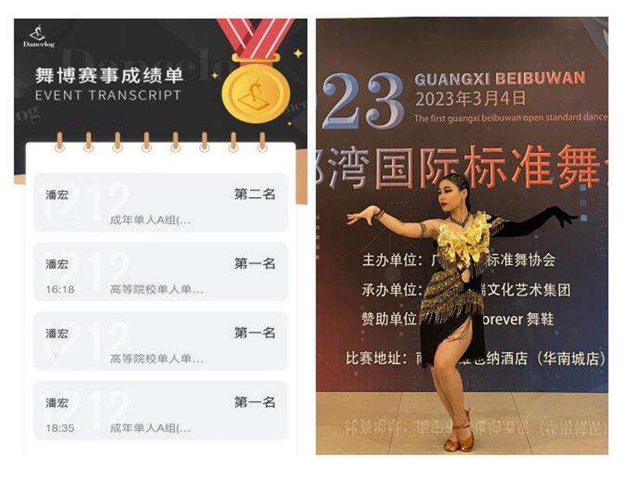3月4日,中国·广西首届北部湾国际标准舞全国公开赛在广西南宁正式开赛。由人文教育学院舞蹈表演专业(国标舞兼修)学生潘宏、丁小丫、王雨嫣、王雨桐组成的北海艺术设计学院国标舞代表队,在青年教师李晓飞和周琦涵的带领下出战比赛,一举斩获冠军8项、亚军2项、季军2项、殿军1项的佳绩。