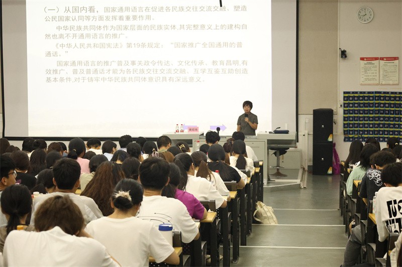 讲座过程中,黄昭艳教授以汉语言规范及其素养所指为例,为现场师生生动讲述了现代汉民族共同语规范的概念。普通话的标准是以北京语音为标准音,以北方话为基础方言,以典范的现代白话文著作为语法规范。黄教授表示,现代汉语规范化就是确立现代汉民族共同语明确的、一致的标准,并用这种标准消除语音、词汇、语法等方面存在的一些分歧,同时对它的书写符号一文字的形、音、义各个方面也要制定标准进行规范。
