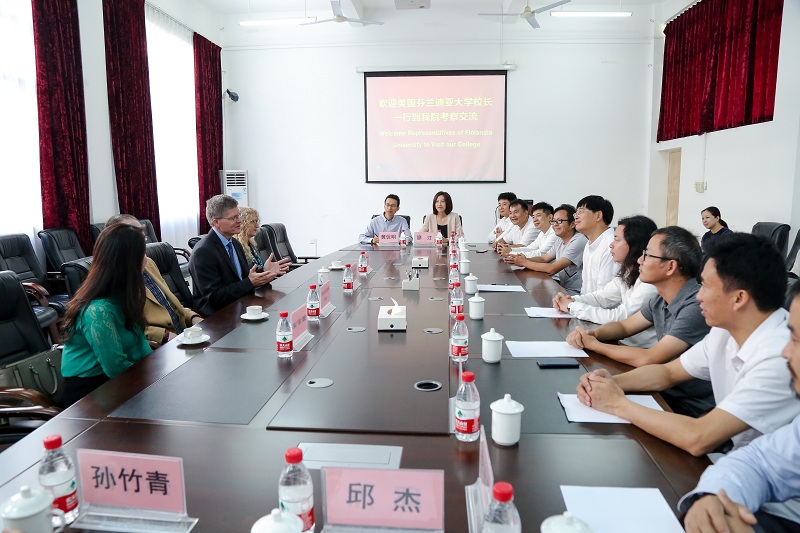 2017年11月11日上午,美国芬兰迪亚大学校长Philip Reubin Johnso教授一行4人到我院进行交流访问。我院副院长郑超、副院长胡胜、副院长王斌、副院长兼党委副书记林秀琪、副院长兼党委副书记彭仁等学院领导热情接待了来宾,并在东校区综合楼一楼会议室进行了会谈。