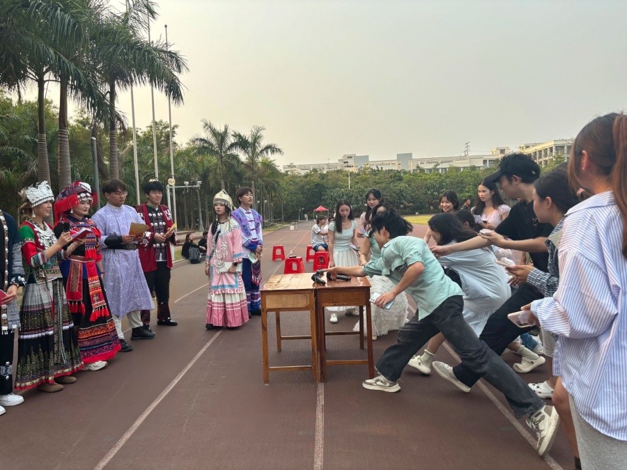 4月15日,学校继续开展“八桂校园石榴红,同心共筑中国梦”民族团结游园活动。竹竿舞节奏欢快,师生携手跳跃,默契配合。抛绣球区域笑声不断,师生在运动中体验壮族传统体育的乐趣。在民族服饰体验区,现场师生换上民族服装合影留念;“民族团结,温情留念”邮局则提供寄语书写服务,不少学子写下祝福,寄予同学亲友或未来的自己。非遗手作工坊开展民族手作体验,晚间还在露天广场播放民族团结主题电影,吸引众多师生观看,在光影故事中深化对“中华民族一家亲”的认同。