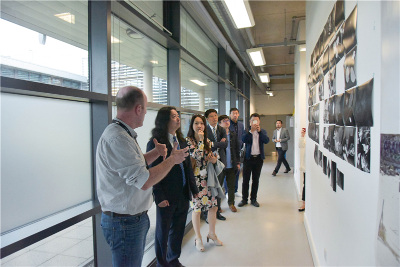会议结束后,双方就中英文化教育特色、双方办学理念进行了深入的探讨和交流,气氛融洽,讨论热烈。在学校领导的陪同下,英国德比大学校领导一行人参观了我校校园环境,并走入课堂深入工作室了解教学情况。