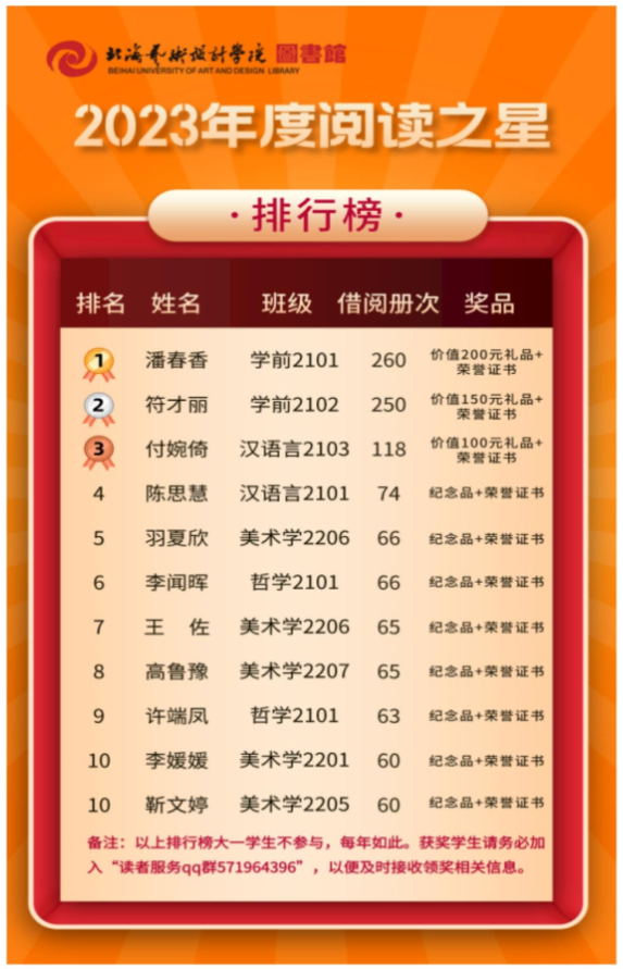 为鼓励更多读者走进图书馆,善用图书馆,爱上图书馆,图书馆每年会整理读者的借阅数据资料,对借阅情况统计排名并表彰,4月23日举行颁奖仪式,为借书量排名前十的读者颁发荣誉证书及奖品,敬请关注。(评选名单见附件1)