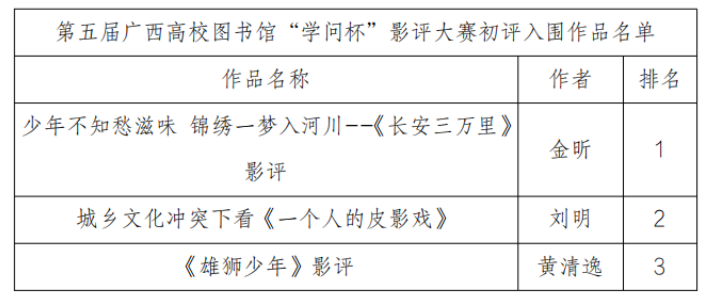 根据《第六届广西高校图书馆“ 学问杯”影评大赛》的评选要求,图书馆邀请我校四位专家教授对30篇查重合格的作品进行初评,现将初评入围名单公示如下: