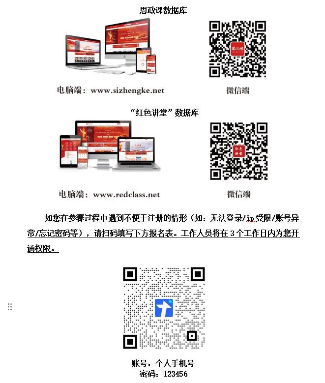 1.参赛学生使用在本校IP地址范围内(网线或WIFI接入)的电脑/平板/手机访问“思政课”或“红色讲堂”数据库的电脑端或微信端,完成个人账号注册。注册成功后,可选择任一数据库作为参赛平台,使用该账号在数据库内学习并获取竞赛积分,该账号也可用于登录竞赛考场参与答题。