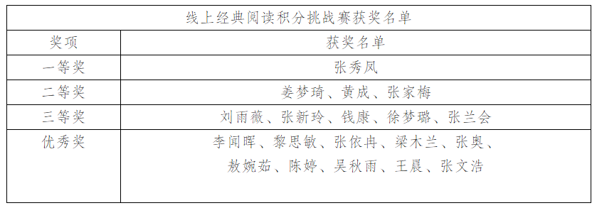 2022年阅读推广活动――线上经典阅读积分挑战赛已经结束,感谢参赛同学们的坚持,现将获奖名单公示如下: