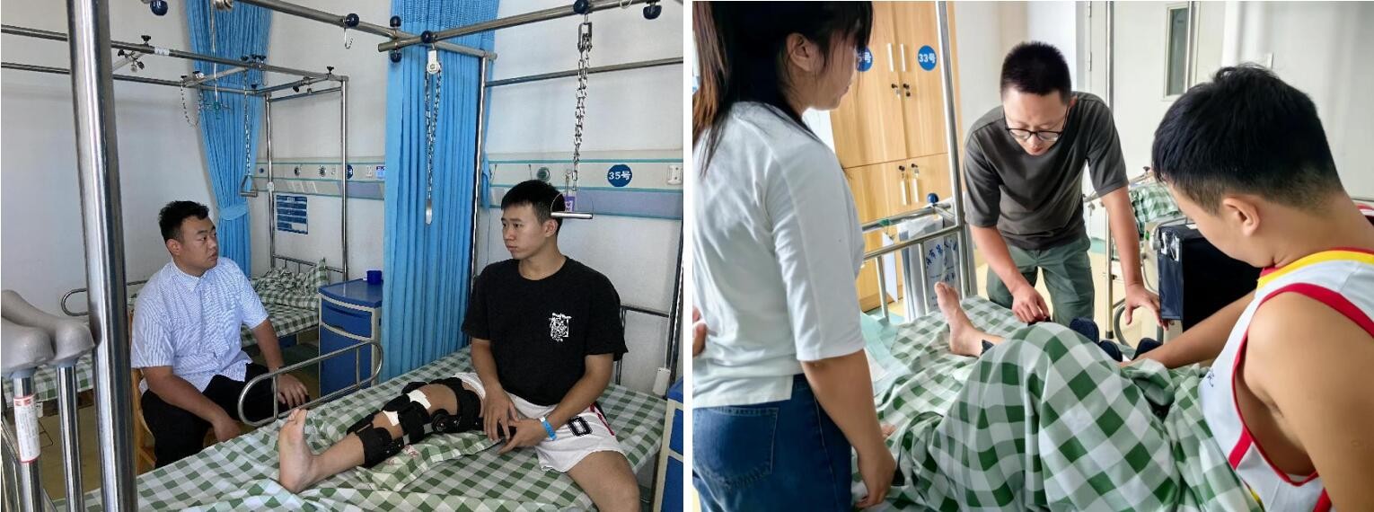 意外发生时,班主任及同学到场关心学生情况,协助其办理入住,96日,班级辅导员代表学校携带慰问金与学生家长一同缴纳治疗费用,并每日前往医院看望学生情况,带着同学们的祝愿鼓励学生配合治疗,早日回归校园。920日,学院领导鲁明阳接送学生出院,并联系学校安排一楼单人宿舍,方便学生行走和康复训练。