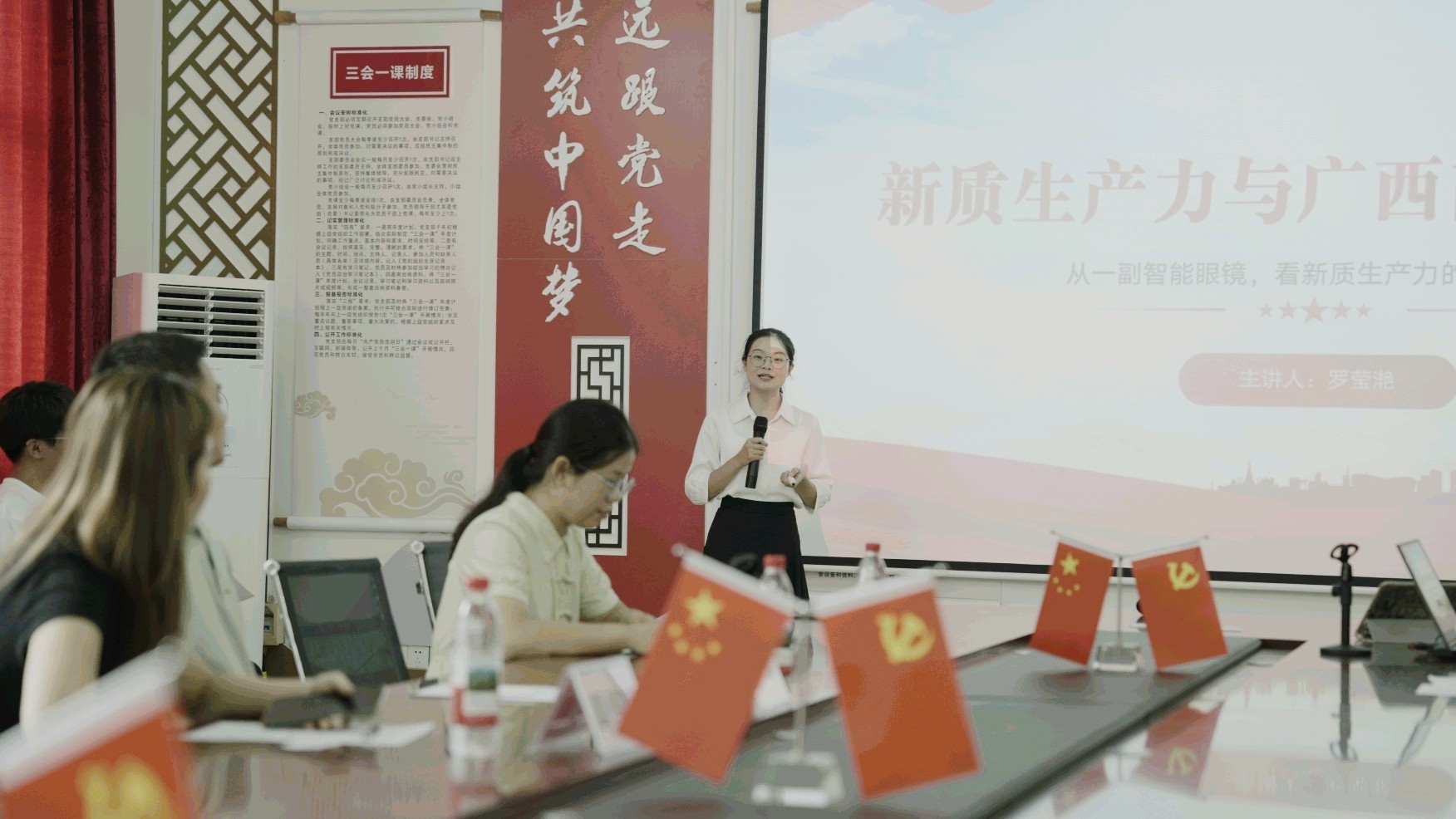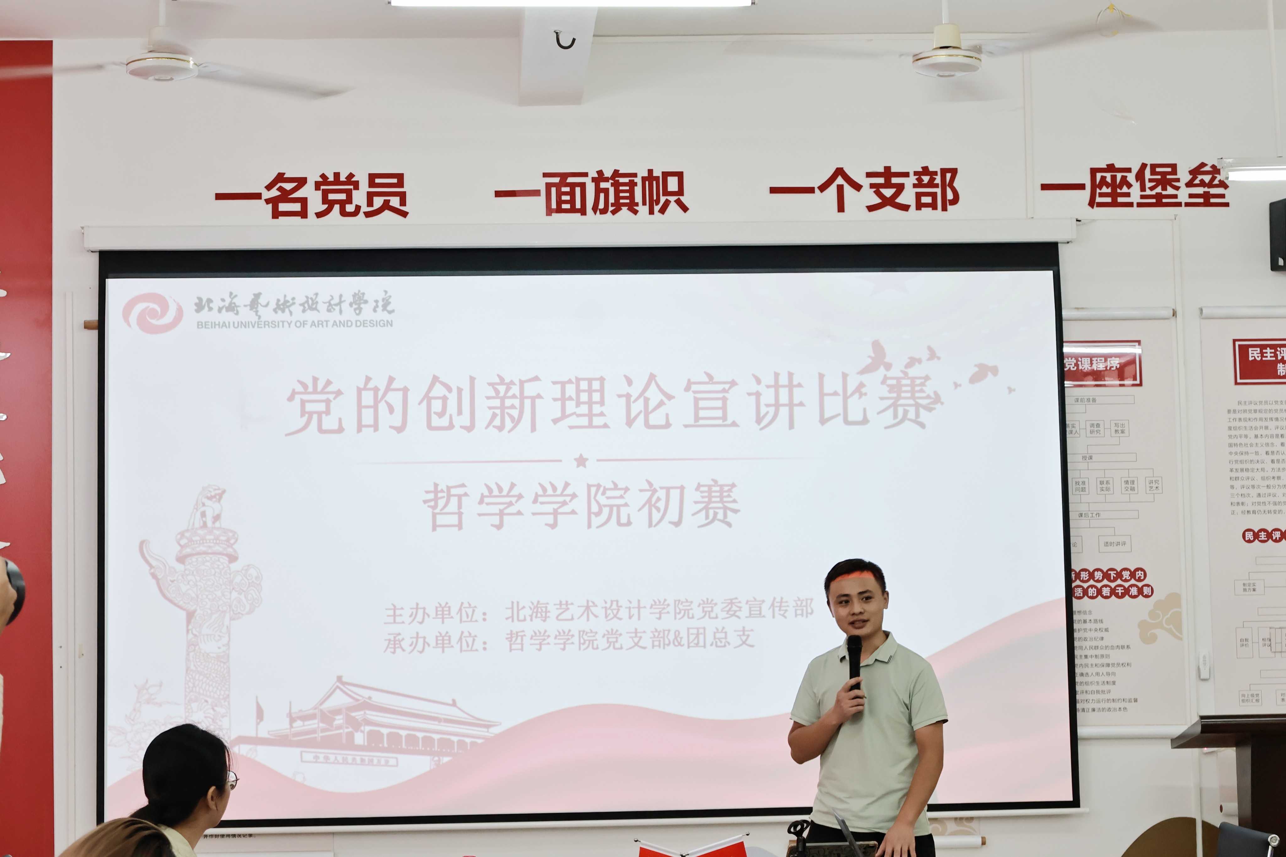 深入学习贯彻习近平新时代中国特色社会主义思想,不断增进我校青年学子对党的创新理论的理解和认同学校党委宣传部联合各二级学院,组织开展党的创新理论宣讲大赛。哲学学院党支部及团总支积极响应,于10月16日中午在西校区公德楼204会议室举办院级初赛。哲学学院党支部书记谢伟、副院长覃传茵及学院综合办谢佩玲老师出席活动并担任评委。