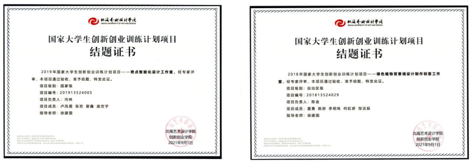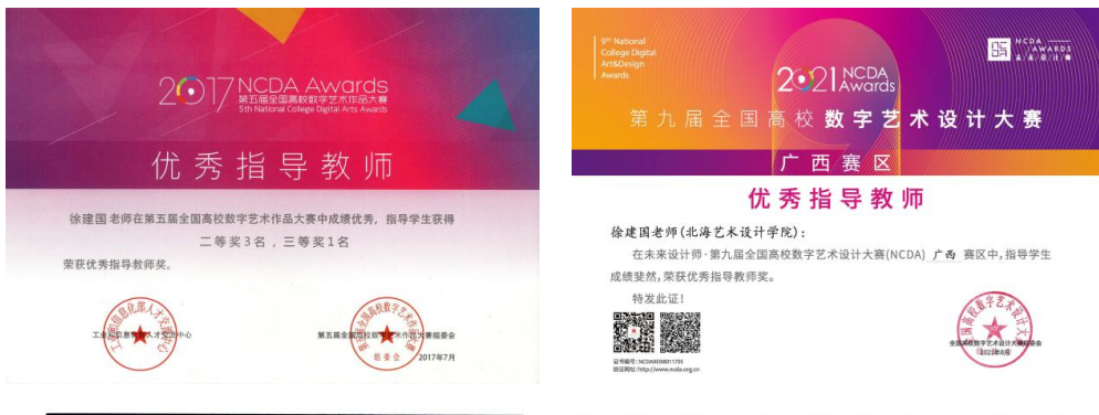 实践育人,教学相长,亲自带领,鼓励学生积极参与校企合作教学,帮助学生提高实践能力和学习效果。从教以来,徐建国老师多次指导学生参加大学生创新创业训练项目和实践学习,收获荣誉多项。如:2021年,指导学生陈金完成自治区级2018年大学生创新创业训练项目《绿色植物背景墙设计制作创意工作室》,项目编号201813524029;指导学生向奇完成2019年国家级大学生创新创业训练项目《奇点智能化设计工作室》,项目编号201913524005。2017年,指导学生吴清清参加第五届NCDA大赛,荣获全国总决赛二等奖;2021年,指导学生陈孔雯参加第九届全国高校数字艺术设计大赛,荣获全国总决赛三等奖;2022年,指导学生张芷琪参加全国大中学生第11届海洋文化创意设计大赛,荣获佳作奖;同年,指导学生姚永康、关书晓参加学院杯中国室内与环境设计大赛,荣获室内组优秀奖。