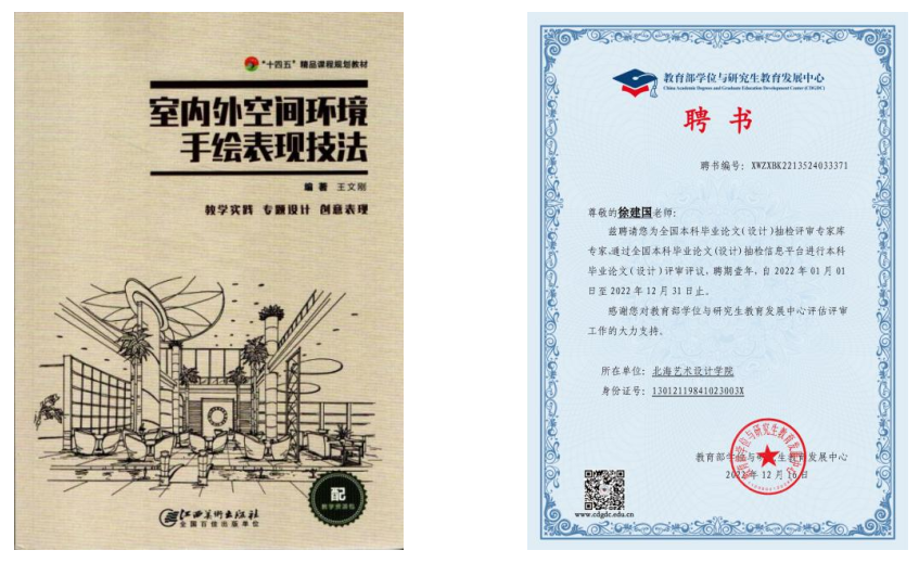 专注学科建设,聚焦环境艺术设计,徐建国老师积极开展教学实践与理论研究。2019年,参与出版了教材《室内外空间环境手绘表现技法》;2022年,参与完成了校级本科专业《手绘表现技法》核心课程建设项目申报并立项,同年主要成员完成《手绘表现技法》课程并被评为课程思政示范课,授课教师入选课程思政教学名师和教学团队;参与2022年在教育部学位中心上线首次全国本科毕业论文(设计)环境设计专业的抽检工作。入职以来公开发表学术论文13篇,公开发表专业作品6幅。