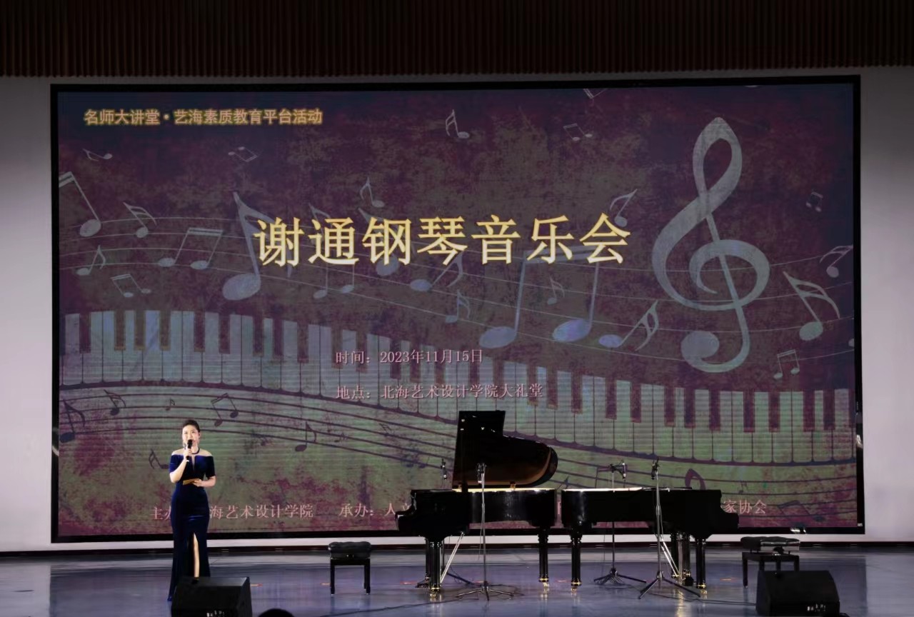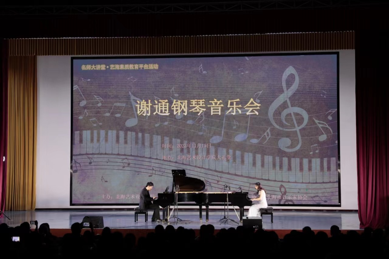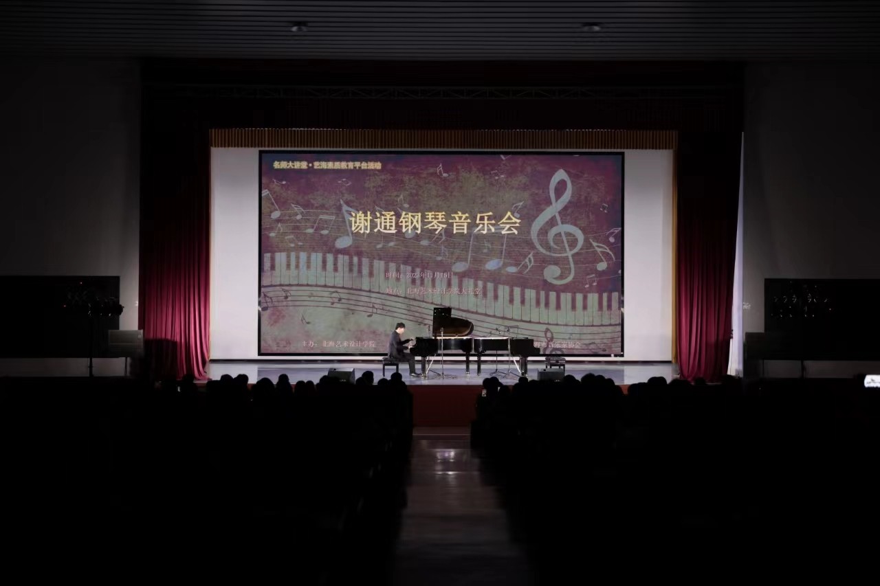 11月15日晚,谢通博士应邀在我校西校区大礼堂举办个人钢琴独奏音乐会。当晚,北海艺术设计学院总督学王斌、人文教育学院院长熊秀峰、副院长李谦等领导与北海音乐家协会、社会各界领导嘉宾同我校师生一起观看了演出。本次音乐会由人文教育学院艺术教育教研室曲忠坤老师主持。