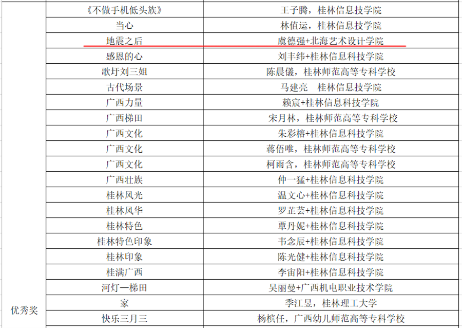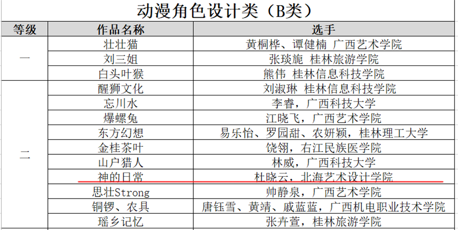 近日,由广西壮族自治区文化和旅游厅、自治区教育厅、自治区科学技术厅、自治区农业农村厅、自治区商务厅、自治区国资委主办,广西广文创意数字科技有限公司承办的“漫绘广西,秀展八桂” 2022广西金桂国漫大赛公示了获奖名单。我校动画与传媒学院共获奖11项,其中场景类二等奖3项、三等奖1项、优秀奖1项;动漫角色设计类二等奖1项、三等奖1项;广西特色文化类三等奖1项、优秀奖3项;孙永辉、 虞德强、李宗毅、吴锡红等老师荣获优秀指导教师奖;动画与传媒学院获优秀组织奖。