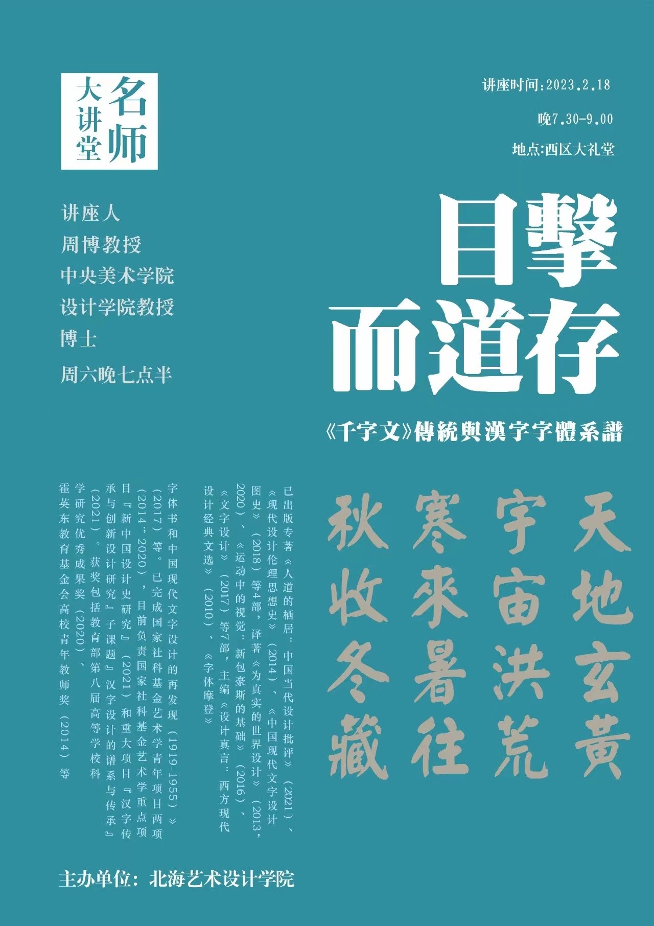 2023年2月18日晚7:30,中央美术学院周博教授于北海艺术设计学院西校区大礼堂,为美术学院师生开展题为《目击而道存:<千字文>传统与汉字字体系谱》的专题讲座。