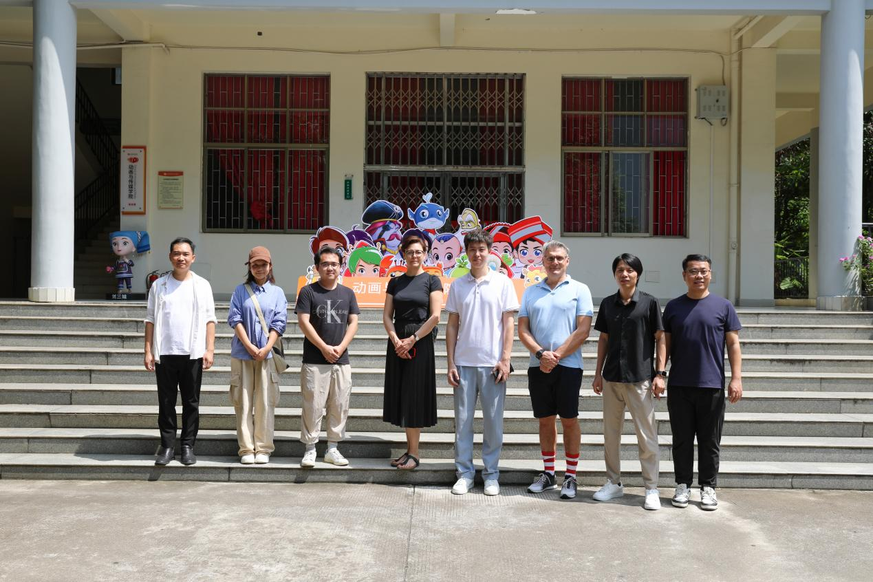 参观结束后,双方在动画与传媒学院综合楼前合影留念。Norbert教授表示,此次访问让他对我校动画与传媒学院有了更深入的了解,也让他看到了两校在动画与数字媒体教育领域合作的巨大潜力。他期待未来能够有更多的合作,促进跨文化交流。