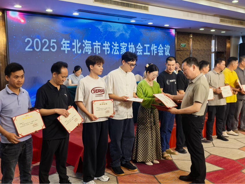 北海市书协主席陈美东作2024年度工作报告,并对获得年度优秀会员进行表彰。书法学院教师熊东、宁梦宇、书法2204班邓钧禧同学荣获年度“优秀会员”称号。这是继2023年我院教师喻广林、李鑫、张天赋获评年度优秀会员后,书法学院师生再次获得此项殊荣。书法学院始终秉持“以赛促学,以展促教”理念,鼓励师生积极参与各级展览、比赛及公益活动,进一步促进书法学专业建设发展。(李鑫 摄)
