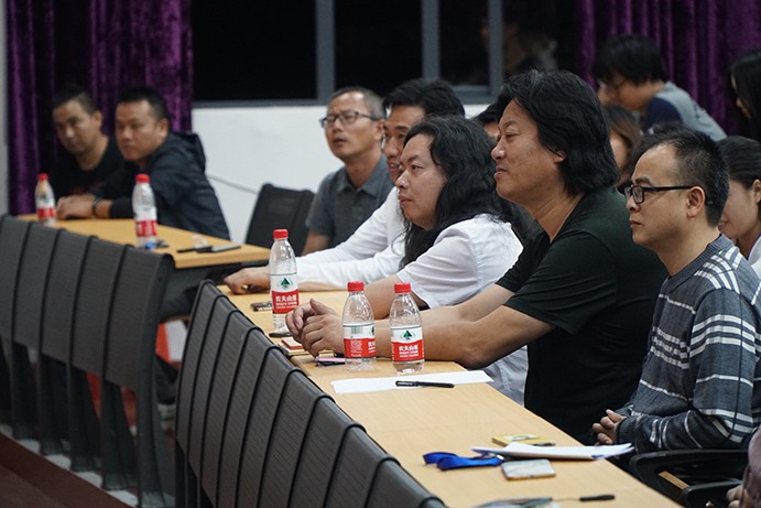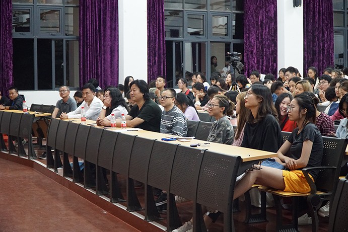 接着,教授分享他们拍摄电影《九色鹿》过程的故事。九色鹿的原型来自于敦煌壁画,教授们为了更加细致入微的让观众了解这个故事,亲自去敦煌莫高窟住了23天,期间画了五本速写,将画纸平铺在地上,跪在地上。抬头作画,低头画像,没有颜料,就地取材,用敦煌的黄土。就是这样的一位先生,为艺术献身,为我们呈现出这种好的艺术作品。