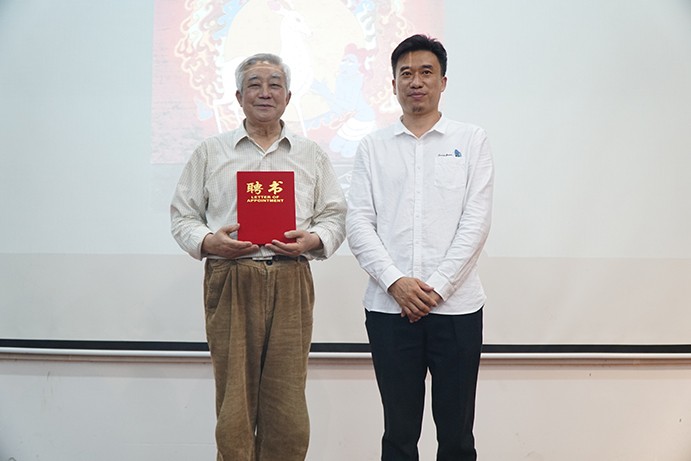 讲座开始,冯健男教授感谢我校领导邀请他来演讲并且深感荣幸,对我校的校园文化建设十分赞赏,对我校未来发展形势十分看好。感慨我们新中国发展的快速,同学们现在可以在宽敞而明亮的教室里听课,回忆自己当初大学时代的艰苦岁月。激励我们当代大学生作为将来的文艺工作者,不忘初心,砥砺前行。然后,陶院长向冯教授颁发赠书证书以及正式聘请教授为我院客座教授。