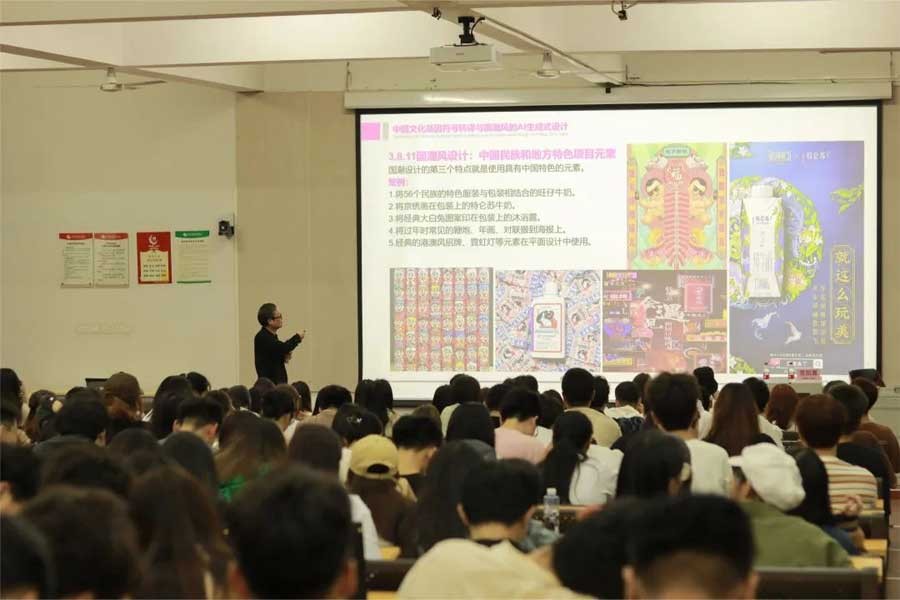 讲座伊始,范凯熹教授详细讲述了讲座课题的由来,并将其拆分为“何为国潮设计风”“何为中国文化基因符号”“如何通过AI生成式设计呈现”三个方面进行内容讲解。他阐述了国潮是将以中国传统文化基因为主进行的再创新、再发展,国潮流行的背后不仅是中国制造、中国品牌的崛起,更是中国情怀、中国自信的彰显,进而带领在场师生深入了解中国非物质文化遗产基因数据库的建设与特点。
