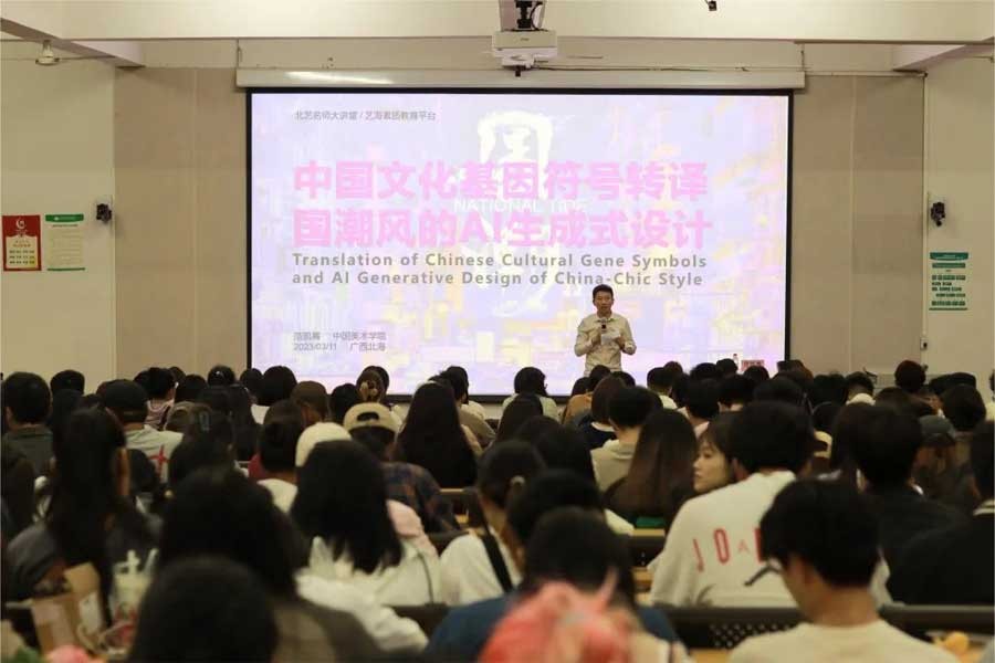 3月11日晚,于我校西校区伦理楼107,中国美术学院教授、博士生导师范凯熹为我校师生带来一场题为《中国文化基因符号转译与国潮风的AI生成式设计》的精彩讲座,讲座由设计艺术学院副院长白建强主持。