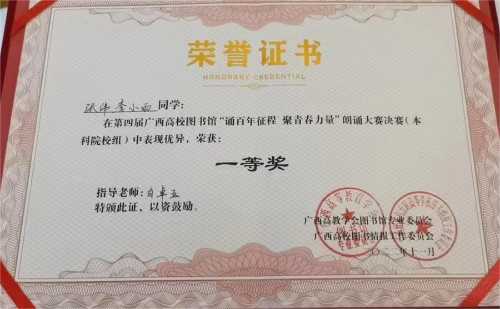 11月18日-19日,第四届广西高校朗读大赛决赛在广西建设职业技术学院顺利举行。我校动画与传媒学院学生张伟、李小雨代表学校参赛并在众多选手中脱颖而出,荣获本科院校组一等奖。