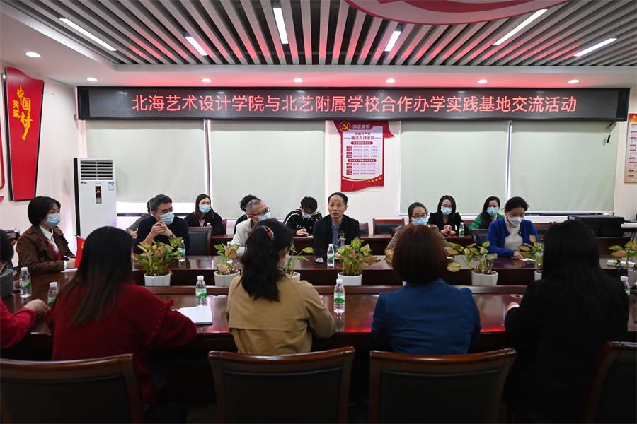 郭庆教授和考察团队一行到北海艺术设计学院附属学校“校校协同”项目进行考察。该校校长包玉红热情欢迎考察团队的来访,并带领考察团参观学校环境。在校训“道德”石碑前,包校长向郭教授及考察团成员介绍了两校一衣带水,一脉相承的历史渊源,对两校的合作过程中北艺对附校的帮助与支持表示感谢。随后一行人在北艺附校会议室进行了深入的座谈和交流。