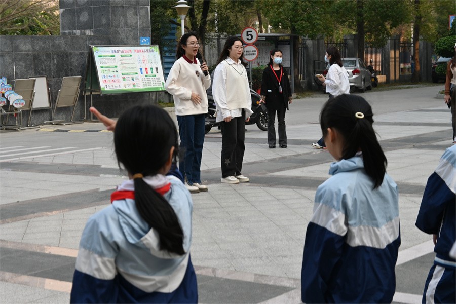 志愿者教手势舞和雷锋歌曲