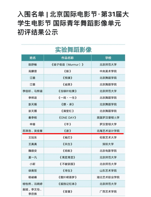 【北京国际电影节】是中国第二个获得国际电影制片人协会认可(FIAPF)的国际A类电影节。“国际青年舞蹈影像”单元主要面向全球范围内的青年创作者,征集多元化、跨类型的舞蹈影像作品,电影节鼓励全球范围内高校师生、新生代青年艺术家进行具有时代意义及创新性的创作,让舞蹈艺术与影像艺术突破边界、跨界融合产生新的生命力。本届国际青年舞蹈影像单元收到上百部作品,分别有10部舞蹈VLOG、20部实验舞蹈影像、4部舞蹈电影与纪实影像、17部舞蹈摄影入围最终评审,我校作品《渡》是其中一部。