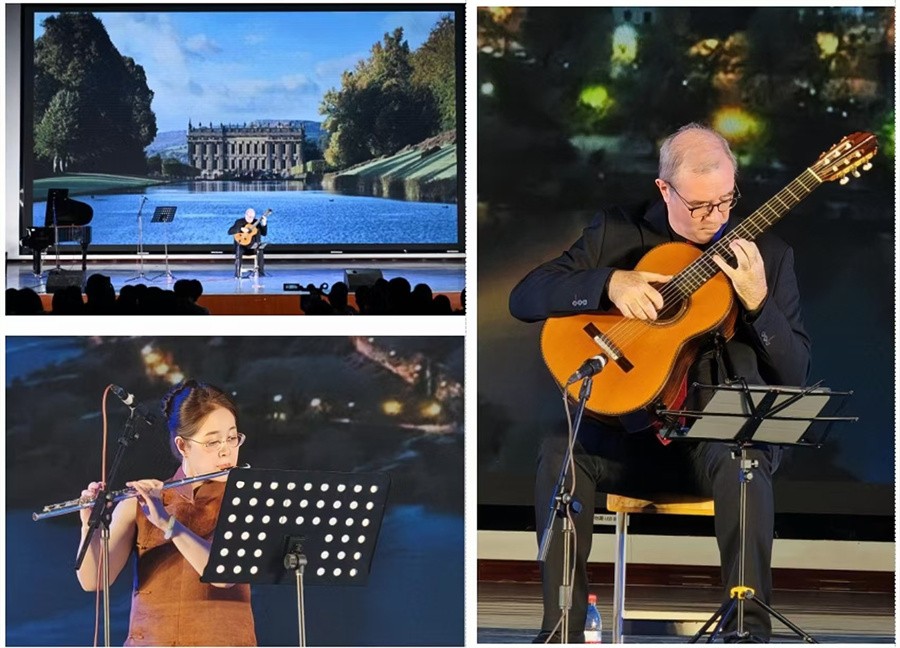 音乐会还加入了钢琴、二胡、声乐等多种表演形式,融合了东西方音乐元素。在音乐会尾声,埃瑞克·佛朗塞利与郝雪雯教授携手我校音乐教师张靖茜、刘元珍、卢尚蕊老师共同演绎了曲目《青花瓷》《大鱼》,为音乐会画上了圆满的句号。