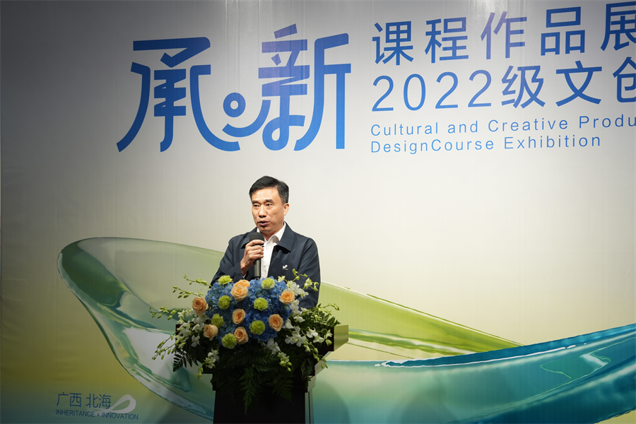 11月22日上午,设计艺术学院视觉传达设计专业 “承·新” 2022级文创产品设计课程作品展在学校展厅八层北面拉开帷幕。学校副校长陶立阳,桂林电子科技大学北海校区设计与创意学院院长葛俊杰,合浦汉代文化博物馆馆长廉世明、北海远见传媒集团副总经理王斌,北海远见传媒集团副总经理廖艺艺,北海银方健康产业有限公司副总经理崔玉丰,创新创业学院副院长陈渤水出席展览开幕式。设计艺术学院党总支书记黄锦、院长李林平、党总支副书记林秀琪、副院长白建强、李佩、邓渠成、吴慧霞,以及马振庆、郭强、彭馨弘、傅颖哲等教授及任课教师和2022级学生参加开幕式。开幕式由视觉传达设计专业教师王昳凡主持。