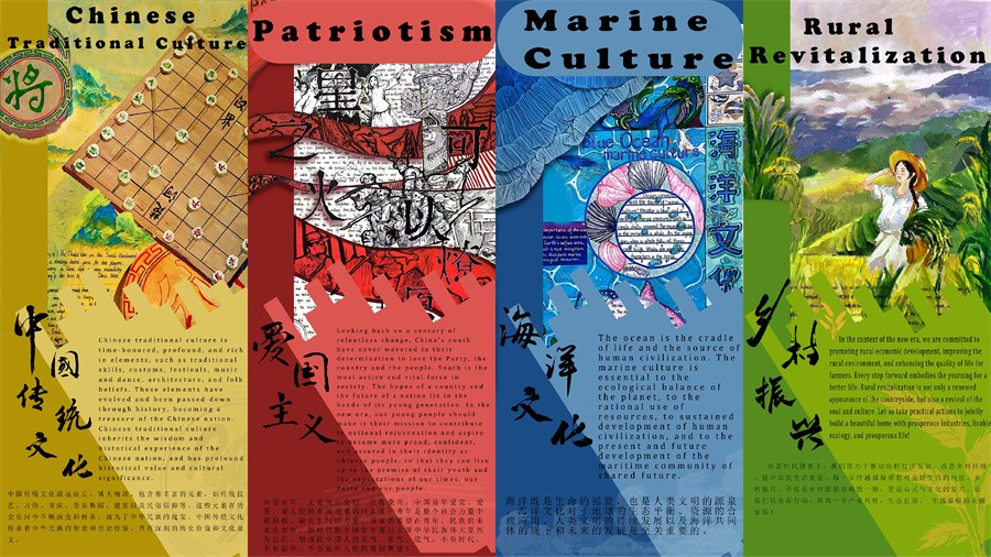 此次“英语+专业”优秀作业展展出作品均为我校通识教育学院外语教研室教师在2023级学生当中布置的英语作业。展览共计展出学生360幅优秀作业,包含中国传统文化、爱国主义、数码科技、乡村振兴、英雄、体育、海洋文化和年轻一代八个主题内容。