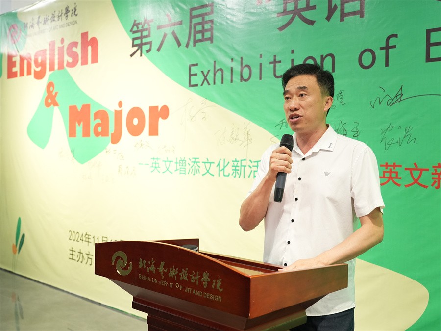 开展仪式上,副校长陶立阳为展览致辞。他表示,展出的每一件作品均凝聚了同学们的智慧与辛勤汗水。这些作品不仅生动展示了同学们在英语学习道路上的不懈追求与优秀成果,而且深刻反映了同学们对社会现象和文化内涵的敏锐洞察力与独到见解。它们更是同学们对国家、社会及未来进行深刻思考和坚定信念的有力证明。
