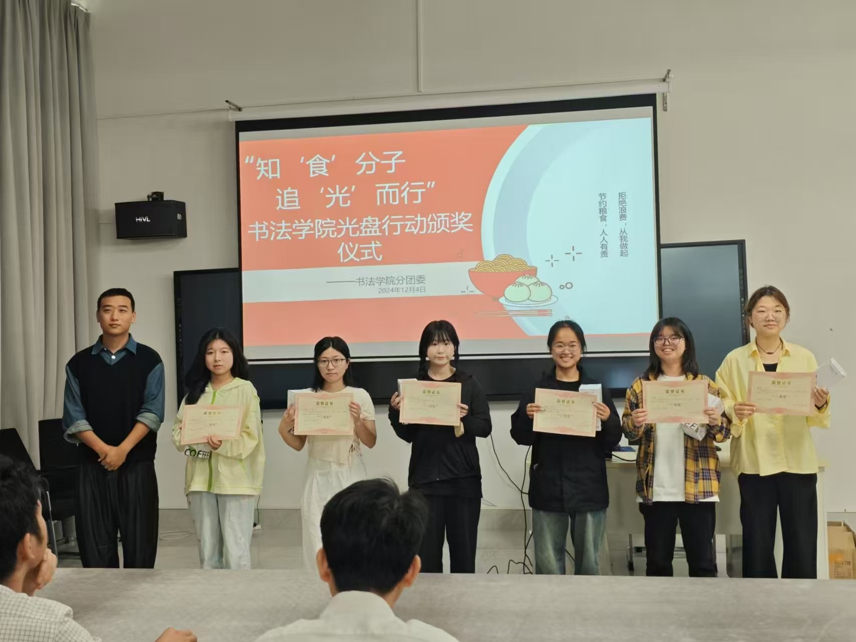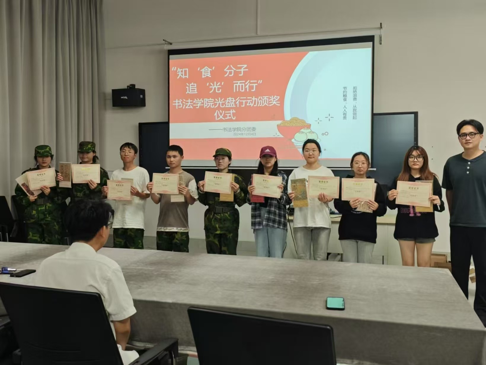 12月4日在南校区艺德楼507书法教研室进行“知‘食’分子,追‘光’而行”光盘行动的颁奖仪式,由书法学院院长苏乃从、党支部书记喻广林、学工办主任兼分团委书记李家琪、实验室主任宁梦宇等各位领导老师为获奖同学进行颁奖。
